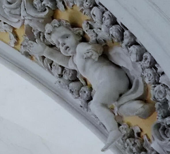 Своды пресбитерия костёла иезуитов отделаны стукковым растительным орнаментом и путти. Центральное место в композиции занимает рельеф Богоматери с младенцем. Скульптурная отделка выполнена на высоком уровне, и её стилистические особенности позволяют предполагать авторство выдающегося итальянского скульптора Пьетро Перти. Этот мастер работал при дворе Казимира Яна Сапеги, как раз тогда, когда магнат помогал в строительстве гродненским иезуитам.