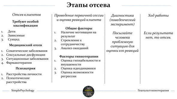 Гипнотерапия не применяется при: пограничных расстройствах, расстройствах психотического спектра, работе с характером (здесь возможна только комплексная работа), а также при работе с соматическими заболеваниями, упор на которые так часто делают мошенники и шарлатаны (онкология и пр.)
