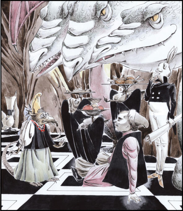 Тут же вылезла из норы за изваянием и готовая невеста новая Змеева забава с болот. Вся нарядная, в шелках да парче, крыса-многоглазка.