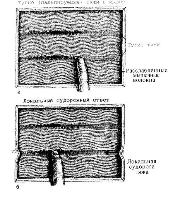 Часто встречаются болезненные уплотненные длинные тяжи, представляющие собой мышечный валик, в котором образуется триггерная точка и спазмируется целое мышечное волокно, а не в одном месте, в конкретной точке. Такие тяжи особенно часто встречаются между лопатками и позвоночником. По направлению идут косо сверху вниз от лопатки к позвоночнику, иногда прямо, и дают ноющую боль или дискомфортные ощущения усталости в мышцах после физической нагрузки или какой-то длительной позы. После растирания этого места или после того, как размяться, прогнуться назад, пошевелить руками и лопатками, становится легче. Такие тяжи образуются либо симметрично с обеих сторон, либо с одной стороны. Болезненность или дискомфортные ощущения в мышцах ощущаются соответственно с одной стороны, где сформировался такой тяж.