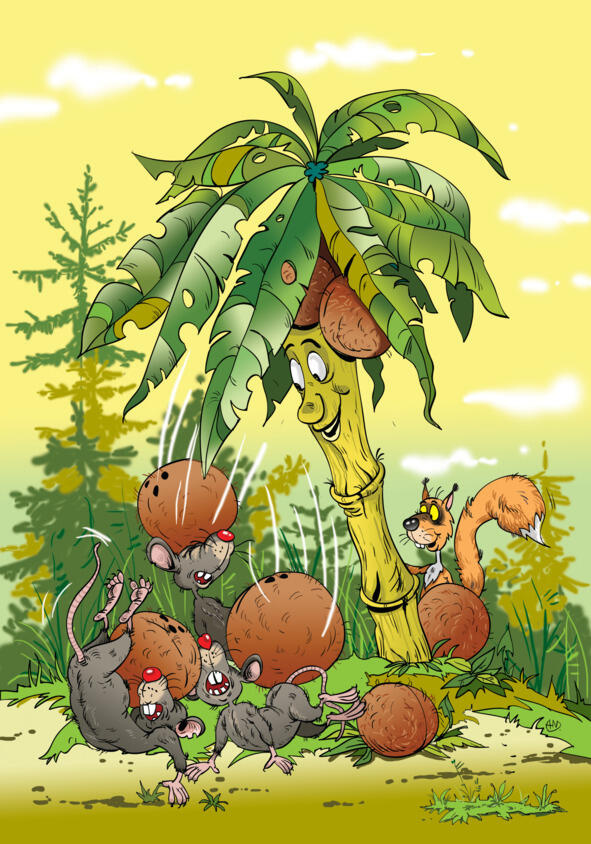 Ореху совсем не понравилась такая идея: быть съеденным крысами. «Парни! На помощь!» закричал он. И тут же остальные орехи посыпались с пальмы и большими прыжками к дубу. Ох и отдубасили они разбойниц те еле ноги унесли.