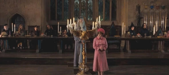 Добрый вечер, дети. Итак, в этом году у нас две новости в отношении преподавателей. Мы рады возвращению профессора Граббли-Дёрг, которая возьмет на себя преподавание ухода за магическими существами, пока профессор Хагрид в отпуске. Мы также хотим поприветствовать нашего нового учителя защиты от тёмных сил профессора Долорес Амбридж. Уверен, что вы вместе со мной пожелаете профессору удачи. И как обычно, наш смотритель, мистер Филч, попросил меня напомнить вам