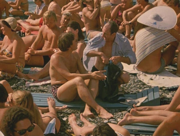 Мужчина на переполненном пляже перепутал свои брюки с чужими. Действие происходит во времена СССР.