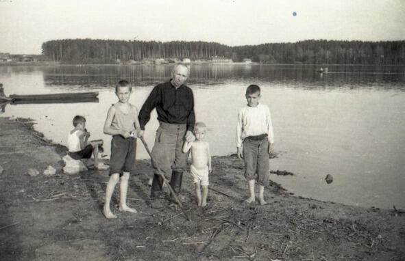 1957 год. Я с отцом, слева стоит брат Сергей. Здесь мне пять лет. В таком возрасте я и стал знакомиться с нашим Заводоуспенским прудом.На фото мы стоим на пяточке мыса Песчаное. Фото сделал старший брат Герман.