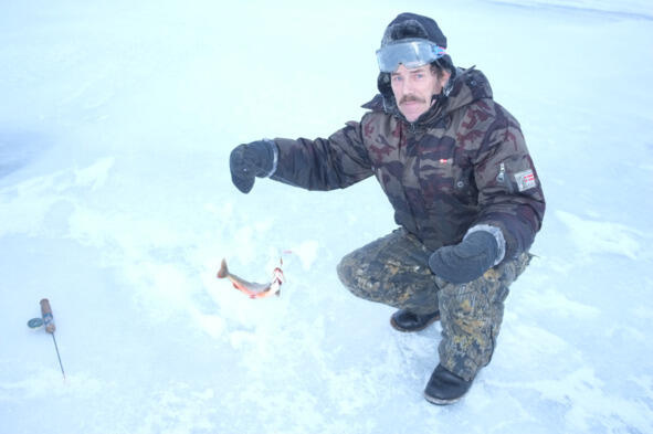 Через двадцать минут мы уже пробурили первые лунки, лед на озере был около 20 см. Я опустил блесну на дно, чуть приподнял, тихонько поигрывая, и тут же ощутил резкий удар. Сделав стремительную подсечку, не давая слабины перебирая леску, быстро вытащил сильную рыбину на лед. Палия была очень красивой, от обыкновенного гольца ее отличает более красочный наряд буровато-зеленоватая чешуя с золотистым отливом, солнечно-золотыми крапами и просто пылающим брюшком! Еще несколько удачных подсечек и на льду появились гольцы другой раскраски.
