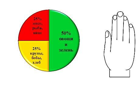 В условиях современного мира, мы не имеем потребности в таком обилии энергии, в каком мы ее потребляем. И все что остаётся этому избытку энергии превратится в жир. Объём желудка натощак в среднем составляет 500 мл у взрослого человека. Съеденная пища в объёме 500 мл это идеальное количество пищи, которое легко переварить в химус. Химус это частично переваренная масса, пищевой комок, который формируется в желудке для дальнейшей переработки. Феноменальная способность желудка растягиваться до объема 4 литров, это гибельный и верный путь к ожирению. Если посмотреть на объём пищи за один приём, который съедает человек с избытком жировой массы, то наверняка получится 1,5-2 литра. Нет необходимости заново «изобретать колесо», искать модные диеты, морить себя голодом и т.д. Достаточно посмотреть на свою ладонь, которая подскажет, как должна выглядеть Ваша «идеальная тарелка». Длина ладони от кончика среднего пальца до запястья это оптимальный диаметр Вашей тарелки, объём ладони необходимый объём Вашей разовой порции пищи. Глядя на свою «идеальную тарелку», в идеале, Вы должны видеть 50% от порции это овощи и зелень, 25% это мясо, рыба, морепродукты, яйцо, оставшиеся 25% это крупы, бобы, хлеб.