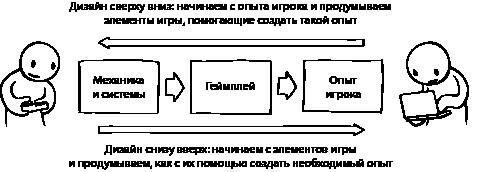 При движении сверху вниз дизайнер начинает с задуманного опыта игрока и решает, как разделить его на несколько частей. Мы продумываем, какого рода геймплей может породить такой опыт, а затем размышляем, какие из известных нам механик помогут создать данный геймплей.