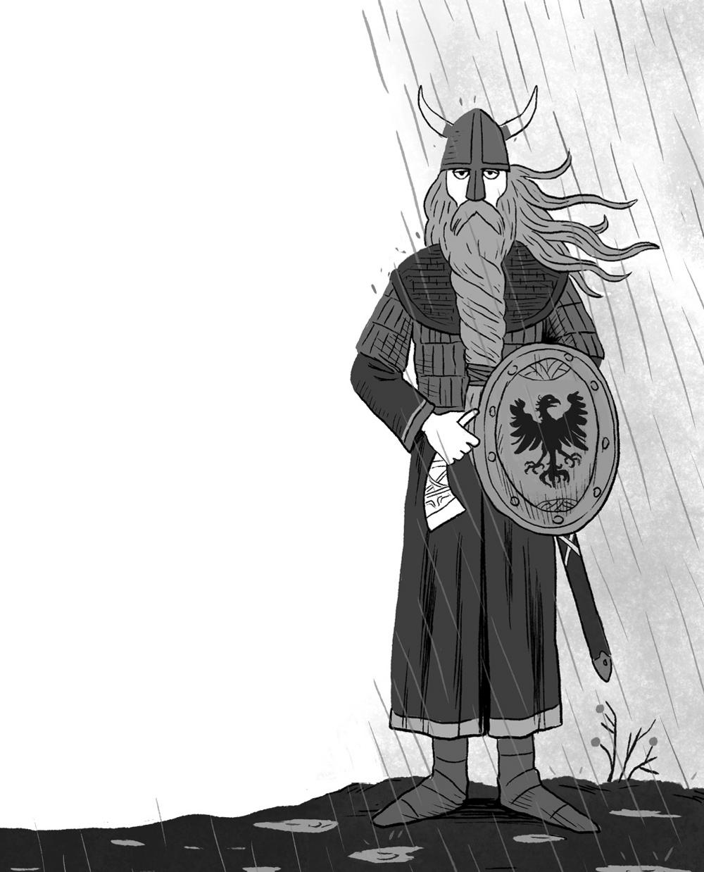 Волосы у него были такие грязные, что я бы не удивился, если бы оттуда показалась блоха-мутант. Борода цвета зрелой моркови, закручиваясь, спускалась ему на грудь. Голову прикрывал металлический шлем, оставлявший открытым лицо, а грудь защищала сверкающая кольчуга. В одной руке он держал щит с символом орла, а меч покоился в ножнах на поясе. Смотрел он с той же живостью, что и коровы на пастбище. Остановившись за несколько шагов, он оглядел нас.