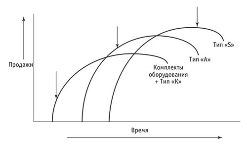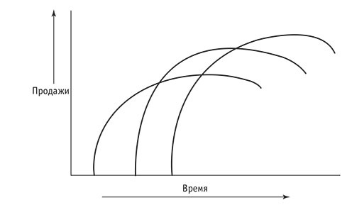 Теперь постройте кривые жизненного цикла / продуктовой линейки (рис. 3.5) для продуктов вашей компании и укажите, где в данный момент они находятся на этих кривых.