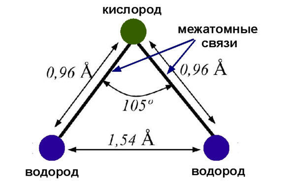 В молекуле воды атомы водорода относительно атома кислорода образуют равнобедренный треугольник, расположение атомов в молекуле воды, в состоянии жидкости, показано на рис 3. Размеры на рисунке приведены в ангстремах Å, как это принято в ядерной физике. Связано это с тем, что один ангстрем приблизительно равен диаметру орбиты электрона в атоме водорода. С другой стороны 1Å=1010м. Отсюда следует, что по диаметру блюдца с водой (15 см) могут поместиться около миллиарда молекул воды.