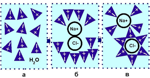 Полярность воды приводит к тому, что ее молекулы притягивают ионы электровалентных соединений, при этом разрушая их кристаллическую структуру. Такой процесс происходит, например, с кристаллами поваренной соли NaCl, см. рис. 5.
