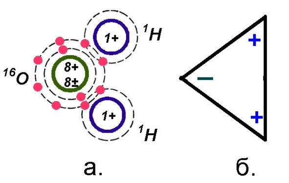 Полярное соединение, или, по химической терминологии, ковалентное соединение характеризуется том, что электронный заряд в нем распределен не однородно. На поз. а рис. 4 показано положение атома кислорода 16О и двух атомов водорода 1Н, у которых электроны как бы захвачены ядром кислорода. В результате кислородный угол молекулы воды несет отрицательный заряд, а два водородных угла положительные заряды, это схематически показано на поз. б рис. 4.