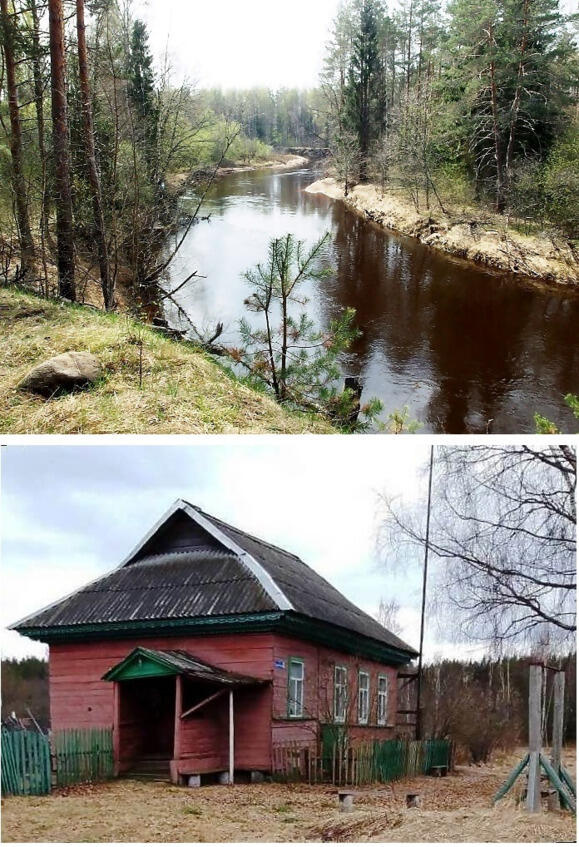 Наверху чёрная холодная река Велеса, приток Западной Двины, течёт с Валдая на юг. Внизу «родовое имение» семьи автора в деревне Зеленьково Жарковского р-на. Фотографии из архива автора
