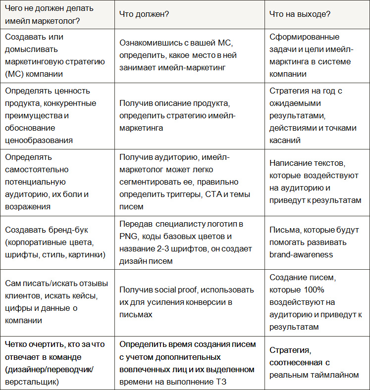 Некоторые знакомые директора по маркетингу жаловались мне, что имейл-маркетолог не справляется с обязанностями. Когда мы начинали разбирать дневные таски, оказывалось, что на специалиста ложилось много задач, которые лежали за рамками их компетенций (про базовые компетенции мы поговорим в другой главе).