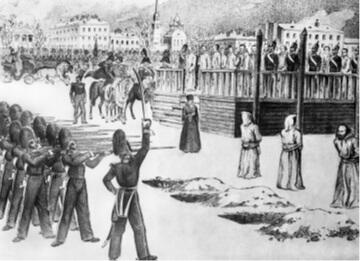 Инсценировка казни петрашевцев на Семёновском плацу. 1849 г. Рисунок Б. Покровского.