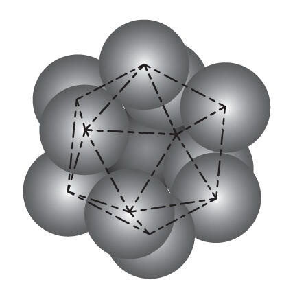 Мы начали со сборки кластера из тринадцати пенопластовых шариков в форме икосаэдра, как я описывал на своей лекции в Пенне: один шарик в центре, а остальные двенадцать в вершинах икосаэдра, как показано на следующей странице.