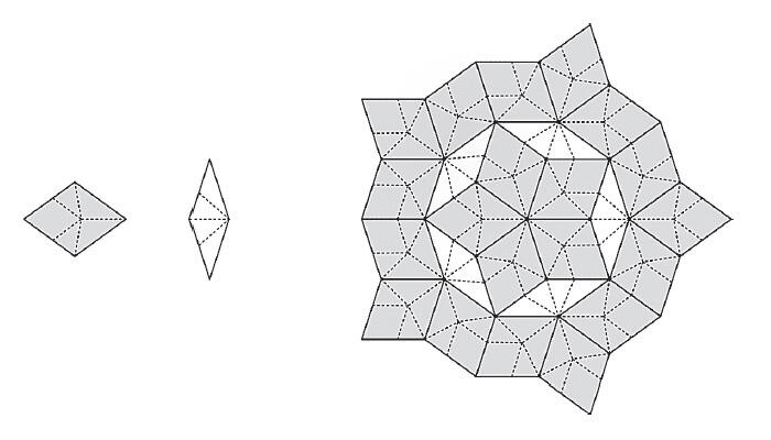 Одна из подсказок состояла в том, что замощения Пенроуза подчиняются так называемому правилу дефляции. Каждый широкий и узкий ромб в замощении Пенроуза можно разделить на части меньшего размера, которые образуют другое замощение Пенроуза. На рисунке внизу исходное замощение показано жирными линиями. Способ разделения, или дефляции, каждой широкой и узкой плитки отмечен пунктиром. Как видно на рисунке, пунктирные линии соединяются и образуют новое замощение Пенроуза с бо́льшим количеством элементов.