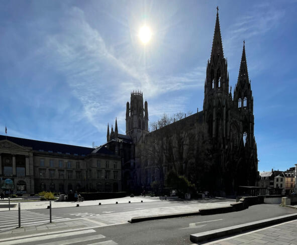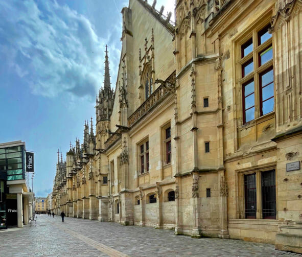 От Дворца правосудия невозможно отойти. Гаргульи и пинакли (декоративные башенки), на стенах следы от пуль и осколков здесь печально перемешалась поздняя готика начала 16-го века и век двадцатый. Многие столетия в здании располагались суд и парламент Нормандии. Мне нравится, как называют такой стиль: «пламенеющая готика».