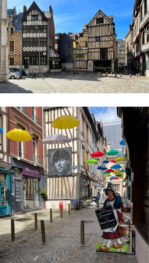 Все туристы рано или поздно приходят на улицу Грос Орлож (Больших Часов) сфотографироваться на фоне арки старых городских ворот, над которыми находятся знаменитые астрономические часы 14-го века. Минутной стрелки на часах нет в средневековье к минутам относились снисходительно. Почему часы астрономические? Над ними устройство (окулус), показывающее фазы луны. Раньше это было важно ведь многие чудотворные снадобья надо было употреблять, например, только при молодой луне. А в полнолуние нельзя было засыпать под лунным светом так и в оборотня можно превратиться. В этом месте надо не только сфотографироваться, но и полюбоваться резьбой по камню. А с другой стороны арки нужно восхищаться резьбой по дереву на колоннах при входе в магазинчик Calcedonia. Да что говорить, если не носиться, не чуя под собой ног, то в старых кварталах Руана можно сделать множество открытий. Надо только остановиться, внимательно оглядеться и «медленно умереть от счастья», как любил говорить мой капитан, с которым мы бороздили просторы ладожских шхер (см. книгу «Ладога»).
