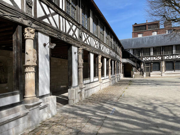 Зашли посмотреть на церковь Сен-Маклу и попали в уютный дворик, окруженный галереями. Резные колонны, фахверк, дерево посреди двора растет Но что-то странное в этих колоннах, странное и в воздухе, ощущается какое-то беспокойство. Специалисты по неизведанному сказали бы, что тут разлита отрицательная энергия (не знаю, что это такое). Оказалось, что мы стоим на месте старого чумного кладбища. Эпидемии чумы были страшными, кладбище стало слишком маленьким, и было решено построить вокруг него три галереи, в которые перенесли кости из более ранних захоронений. С четвертой стороны квадратного кладбища построили христианскую школу для бедных мальчиков. Последние 70 лет в ней располагалась художественная школа, которая переехала в более жизнерадостное здание в 2014-м году. Костей в галереях, конечно, уже нет, но биополе там довольно унылое.