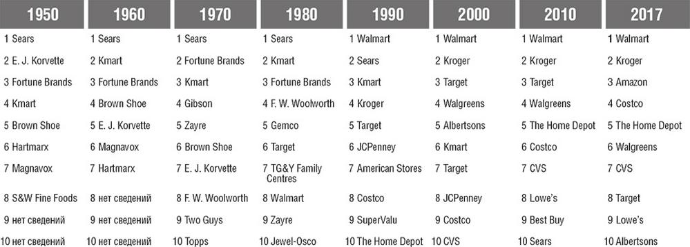 Взгляните на приведенные ниже рейтинги ведущих ритейлеров по десятилетиям и сразу поймете, почему CEO компании Walmart Дуг Макмиллон держит скриншот этой таблицы в памяти своего телефона: она напоминает ему, как быстро может меняться положение ритейлеров на рынке.
