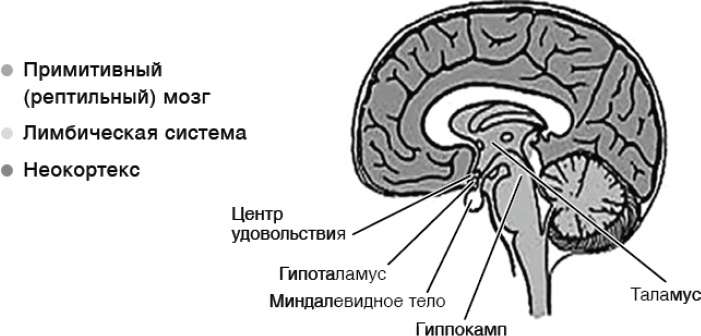 Одним из крупнейших прорывов в изучении саморегуляции стало открытие лимбической системы, которую Джозеф Леду назвал «эмоциональным мозгом». Это комплекс структур, расположенный ниже префронтальной коры (ПФК); его основные структуры миндалевидное тело, гиппокамп, гипоталамус и стриатум. Лимбическая система, и в частности миндалевидное тело и центр удовольствия (в вентральном стриатуме), отвечает за наши эмоции и порывы. Она играет ключевую роль в формировании воспоминаний и эмоциональных ассоциаций, связанных с этими воспоминаниями, как положительных, так и отрицательных. Любовь, желание, страх, стыд, гнев и травмы делят здесь общий «неврологический кров».