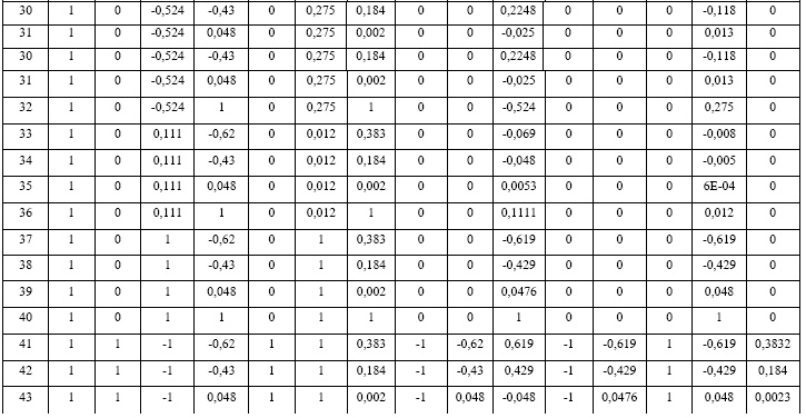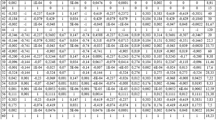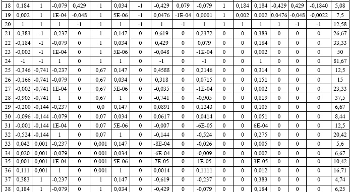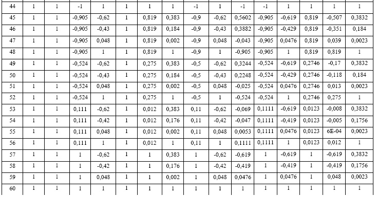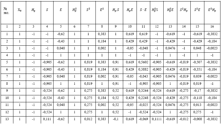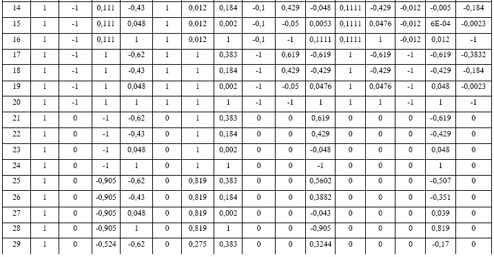 Для определения коэффициентов уравнения приведем результаты расчётного эксперимента к табличному виду. В дальнейших таблицах для упрощения введён параметр X0=1, соответствующий свободной переменной, перед которой стоит коэффициент.