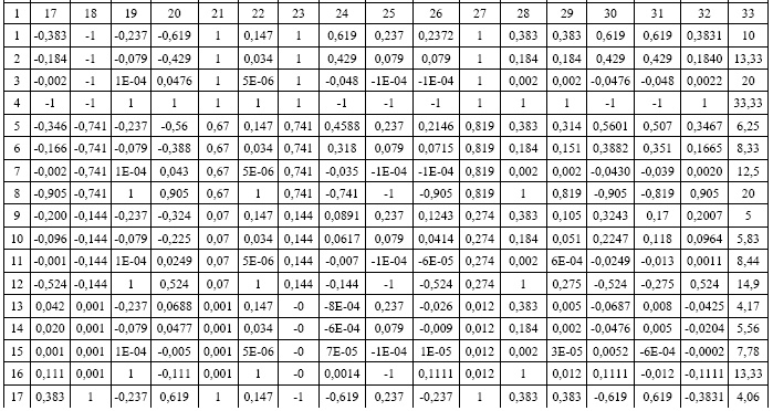 Для определения коэффициентов уравнения была составлена матрица Х, включающая в себя закодированные условия эксперимента (столбцы 2-32 таблицы 2) и матрица Y, включающая в себя результаты эксперимента (столбец 33 таблицы 2). Далее матрица Х транспонируется и умножается на исходную матрицу Х, получается матрица Xт ·X. Матрица Y также умножается на транспонированную матрицу X, получается матрица Xт ·Y. Затем для матрицы Xт ·X вычисляется обратная матрица матрицы Xт·X-1. Перемножив обратную матрицу Xт ·X-1 и матрицу Xт ·Y получим матрицу коэффициентов уравнения. Аналогичные действия были проведены и для других источников. Коэффициенты уравнения представлены в таблице 3.