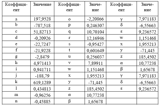 Для определения коэффициентов уравнения была составлена матрица Х, включающая в себя закодированные условия эксперимента (столбцы 2-32 таблицы 2) и матрица Y, включающая в себя результаты эксперимента (столбец 33 таблицы 2). Далее матрица Х транспонируется и умножается на исходную матрицу Х, получается матрица Xт ·X. Матрица Y также умножается на транспонированную матрицу X, получается матрица Xт ·Y. Затем для матрицы Xт ·X вычисляется обратная матрица матрицы Xт·X-1. Перемножив обратную матрицу Xт ·X-1 и матрицу Xт ·Y получим матрицу коэффициентов уравнения. Аналогичные действия были проведены и для других источников. Коэффициенты уравнения представлены в таблице 3.
