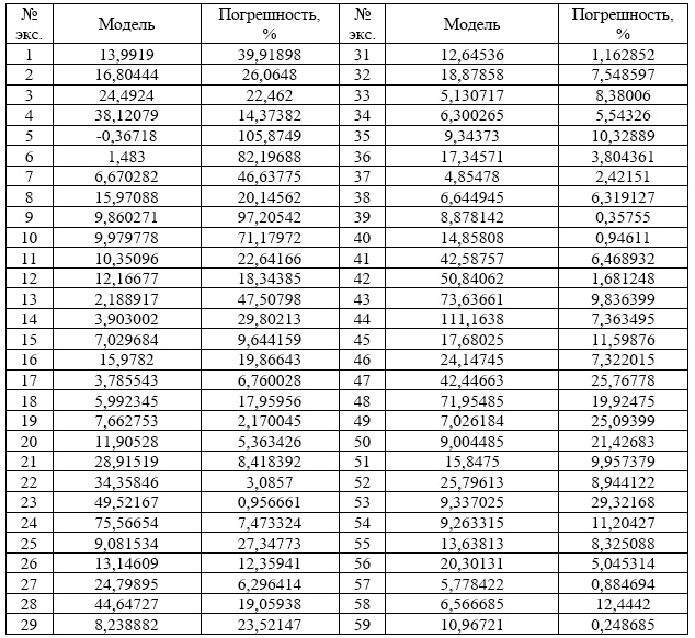 Подставив в уравнение регрессионной модели значение коэффициентов получим расчетные значения удельной мощности. Для проверки модели необходимо определить погрешность по следующей формуле (3):