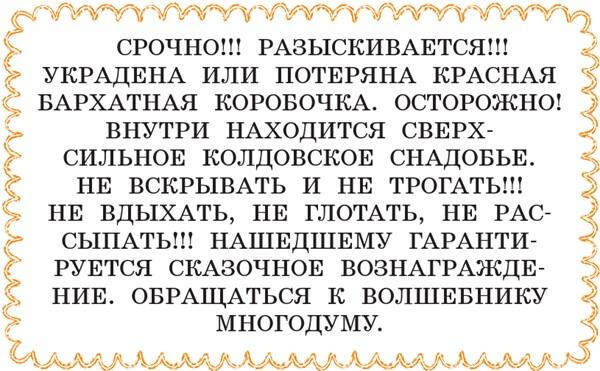 Ах! Вот бы мне найти эту коробочку! мечтательно произнесла матушка Хаббард. Мне бы очень пригодилось СКАЗОЧНОЕ ВОЗНАГРАЖДЕНИЕ! Ну почему мне так не везёт? Наверняка эту чудесную коробочку найдёт кто-то другой, а мы с Пэдди так и будем жить на три фунта в неделю. Бедняжка Пэдди! Верный, умный мой пёсик! Как бы я хотела, чтобы у меня в буфете всегда водились для него аппетитные мясные кусочки и сладкие мозговые косточки!