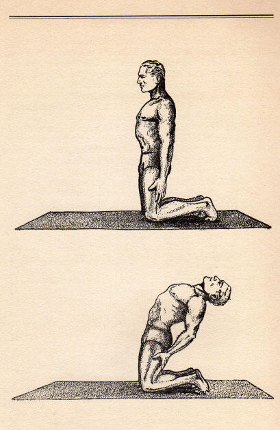 Третий ритуал следует практиковать сразу после выполнения ритуала номер два. Он, тоже очень простой. Все, что нужно сделать, это встать на колени на свой «молитвенный коврик», положить свои руки на бедра и наклониться вперед, насколько это возможно, наклонив голову так, чтобы подбородок касался груди. Теперь откиньтесь назад, как можно дальше, в то же время голова должна быть поднята и запрокинута назад до упора. Затем поднимите голову вверх вместе с телом. Снова наклонитесь вперед и начните ритуал сначала. Этот ритуал очень эффективен для ускорения вихрей «Е», «D» и «С», особенно «Е».