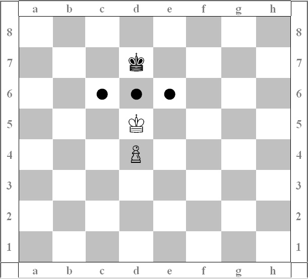 5. Поля, обозначенные точками на диаграмме 4, называются полями взятия в случае борьбы королей между собой, или спорными, или ключевыми, если игра включает пешку (пешки). Занятие ключевого поля приносит победу (или ничью за слабую сторону) независимо от того, кто его делает.