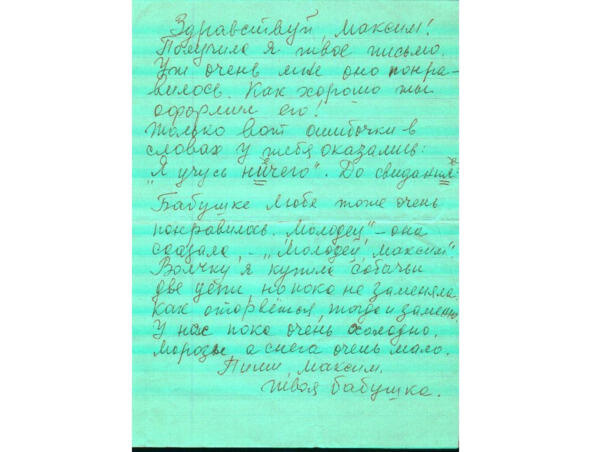 Помню первое в жизни письмо, которое получил. Письмо от бабушки, с надписью на конверте Максиму Кудряшову. Мне было, наверное, лет 78, и я очень гордился, что уже письма получаю. И сам писал бабушке письма, а она отвечала. Пример такой переписки ниже на фото.