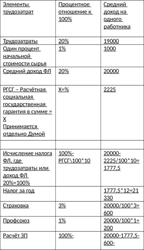 В субъекте исследования, где элемент трудозатраты = заработная плата ФЛ, должен быть в пределах 20% от полного дохода производства (при исчислении налога с физического лица сумма заработной платы определяется в 100%). Остальные затраты производства должны быть не более 29%, и приплюсованная доходная часть 51%, для определения налоговой базы равной 80% общего дохода предприятия, далее исчисления налога с юридического лица.