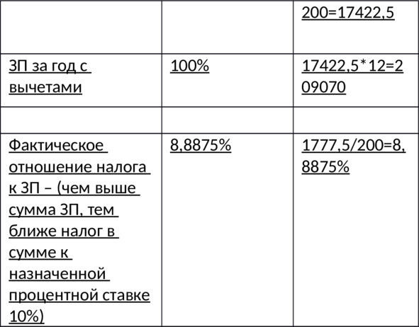 Установленная законом «единая процентная ставка налога с физического лица» должна быть не более 10% +3% страховых взносов на медицинское и пенсионное страхование. Необходим вычет расчётной государственной социальной гарантии в процентном, а впоследствии и цифровом выражении (РГСГ=х назначенной суммы). Расчётная государственная социальная гарантия РГСГ необходимая мера для уравнивания прав работающих граждан, вносящих свой труд и налоги в государство по отношению к не работающим гражданам. Не работающие граждане, пользуются социальными гарантиями без всяких трудозатрат и налогов.