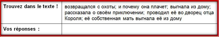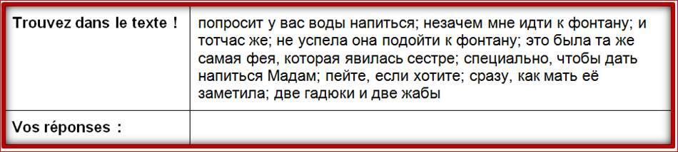 1. Oui-dà (да-да), ma bonne mère, dit cette belle fille ; et rinçant aussitôt sa cruche, elle (puisait, puisa, puisera) de l'eau au plus bel endroit de la fontaine, et la lui (présenta, présentait, présentera) , soutenant toujours la cruche afin qu'elle bût plus aisément. 2. Je vous demande pardon, ma mère, dit cette pauvre fille, d'avoir tardé si longtemps ; et en disant ces mots, il lui (sortira, sortait, sortit) de la bouche deux Roses, deux Perles, et deux gros Diamants. 3. C'est sa soeur qui en est cause, elle me le payera ; et aussitôt elle (courut, courait, courira) pour la battre. 4. La pauvre enfant (senfuira, s'enfuit, senfuyait) et alla se sauver dans la Forêt prochaine.