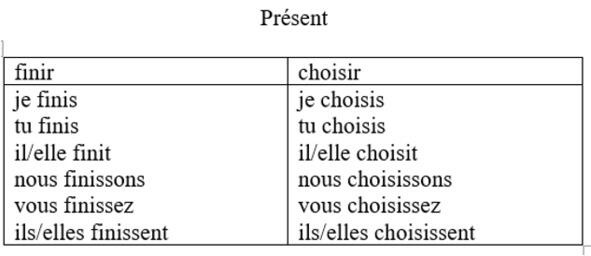 applaudir (аплодировать), choisir (выбирать), établir (устанавливать), finir (заканчивать), jaunir (желтеть), grossir (увеличивать, толстеть), grandir (расти, взрослеть), maigrir (худеть), pâlir (бледнеть), punir (наказывать), obéir à (повиноваться кому-либо), réagir à (реагировать на что-то), réunir (собирать, объединять), relentir (замедлять), réussir (удаваться), réfléchir (размышлять), remplir (наполнять), rougir (краснеть), saisir (хватать), vieillir (стареть).