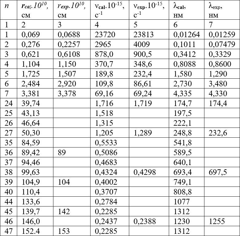 Подставив в уравнение (9) приведенные выше значения величин, получим радиус первой орбиты атома урана, с которой происходит рентгеновское излучение серии Kα1, r = 0,069 пм. Радиусы других орбит рассчитываем по уравнению Бора (4) умножением на квадрат соответствующего орбите квантового числа, см. таблицу 1. Так, например, для следующей рентгеновской L серии при n = 2 получена длина волны λcal= 0,1011 нм при справочном значении λ exp = 0,07479 ни, а для М серии при n = 3 соответственно λcal= 0,3412 нм и λexp = 0,3329 нм. Для других серий при n = 4, 5, 6 и 7 также получено хорошее совпадение расчётных и экспериментальных данных, см. столбцы 6 и 7 в таблице 1.