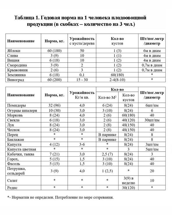 Сколько продукции нужно для здорового питания на одного человека? В таблице 1 приводятся справочные данные о нормах плодоовощной продукции. По этим данным можно определить количество посадок и расположение их на участке в зависимости от расположения солнечной стороны участка и возможности растений расти в полутени.