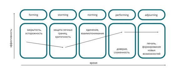 Материал разбит на несколько разделов, посвященных этапам сессии или совещания. За основу взяты стадии развития групповой динамики по Такмену: Forming, Storming, Norming, Performing, Adjourning (рис.1). Подробное описание каждой стадии вы найдете в соответствующем разделе.