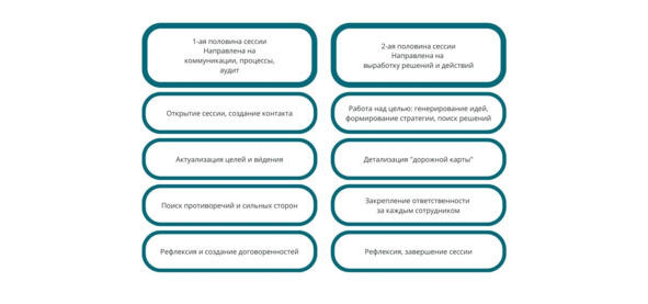 Командная сессия, проходящая все стадии групповой динамики, выглядит так: сначала включаетесь и настраиваетесь с командой, после заходите в шторм или «выпускаете дракона», затем переходите к непосредственной работе над целью, формируете шаги, а завершаете все рефлексией и подведением итогов.