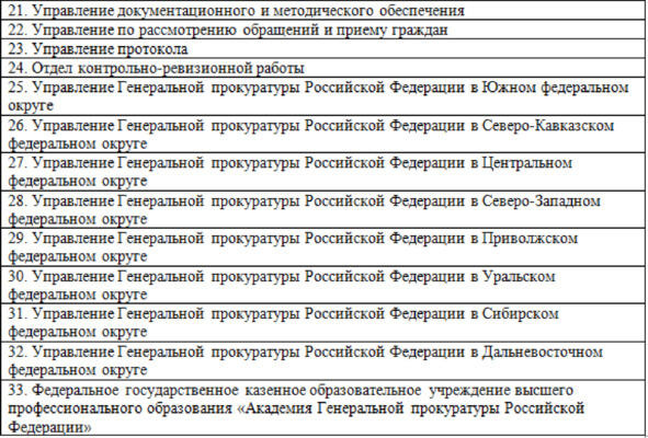 В ФЗ о прокуратуре от 17.01.1992 N 22021 закрепляет статус прокуратур входящих в систему Генеральной прокуратуры: ст. 15 («Прокуратуры субъектов Российской Федерации, приравненные к ним прокуратуры»), ст. 15.1 («Назначение на должность и освобождение от должности прокуроров субъектов Российской Федерации, приравненных к ним прокуроров»), ст. 16 («Прокуратуры городов и районов, приравненные к ним прокуратуры»), ст. 16.1 («Назначение на должность и освобождение от должности прокуроров городов и районов, приравненных к ним прокуроров»), ст. 18 («Полномочия прокуроров субъектов Российской Федерации, приравненных к ним прокуроров по руководству подчиненными органами прокуратуры»), ст. 19 («Полномочия прокуроров городов с районным делением по руководству подчиненными органами прокуратуры»), ст. 46.1 («Главная военная прокуратура»), ст. 47 («Полномочия военных прокуроров»). Полномочия прокуратур определены в Приказе Генпрокуратуры России от 07.05.2008 N 84 (ред. от 12.04.2017) «О разграничении компетенции прокуроров территориальных, военных и других специализированных прокуратур»36.