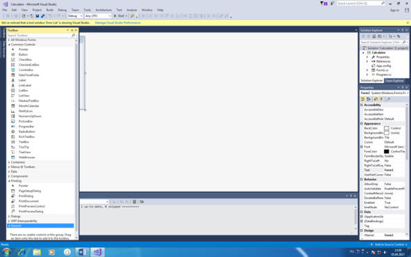 4. Чтобы изменить заголовок формы, в панели Properties в свойстве Text вместо слова Form1 записываем (или вставляем из буфера обмена: правый щелчок, Paste), например, Calculator; щёлкаем по слову Text (или нажимаем клавишу Enter), рис. 2.4.