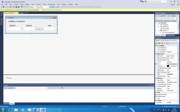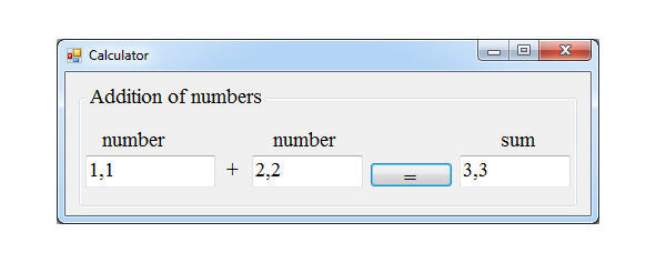 Теперь в файл Form1.cs нам необходимо написать нашу часть кода для сложения двух чисел на форме. Для связывания с кодом элементов управления и компонентов используются методы, которые называются обработчиками событий и вызываются после двойного щелчка по имени соответствующего метода на вкладке Events (со значком в виде молнии) на панели Properties (рис. 2.4). Например, обработчик события в виде щелчка кнопки = (рис. 2.6) вызывается после двойного щелчка по имени метода Click на вкладке Events панели Properties. Но так как щелчок кнопки является наиболее распространённым событием, то он задан как событие по умолчанию и поэтому может быть также вызван двойным щелчком кнопки в режиме проектирования. Выполняем это. Появляется файл Form1.cs со следующим автоматически сгенерированным кодом: