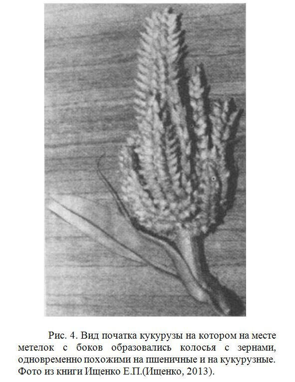 В 1979 году Цзян Каньчжен воздействовал биополем зеленой массы пшеницы на проросшие семена кукурузы. Среди выросшых 7000 стеблей кукурузы у 3850 из них на месте метелок с боков образовались колосья с зернами, одновременно похожими на пшеничные и на кукурузные (Рис. 4 и 5). «Облученная» кукуруза по урожайности зерна вдвое, а по зеленой массе втрое превзошла контрольную группу. Полученные изменения передавались последующим поколениям. Зафиксировано минимум 3 поколения, а по другим сведениям изменения сохранялись в течение 10 лет.