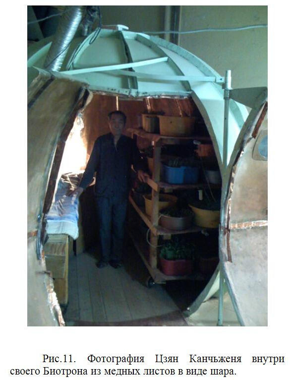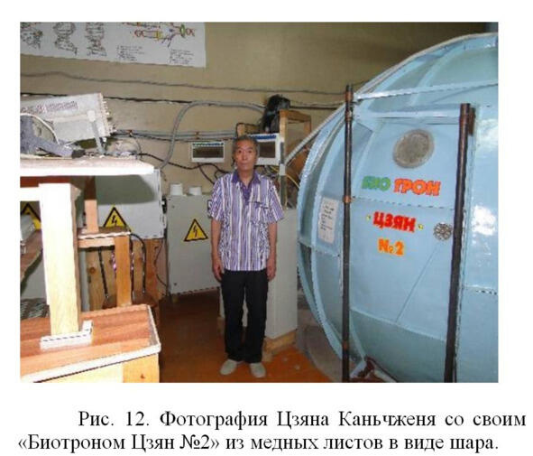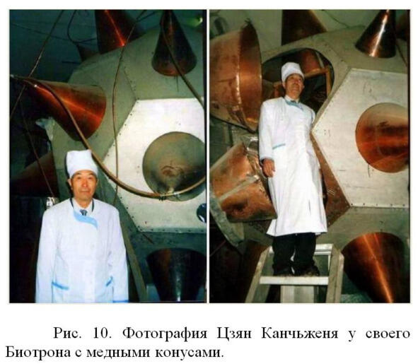 На рисунке 10 показан еще один вариант Биотрона Цзяна Каньчженя с медными конусами. Трубы, которые подходят к конусам это волноводы. Излучение приходит по этим волноводам от донора и от нескольких конусов внутри в центре устройства возникает фокальная зона. К сожалению документальное описание работы этого Биотрона отсутствует.