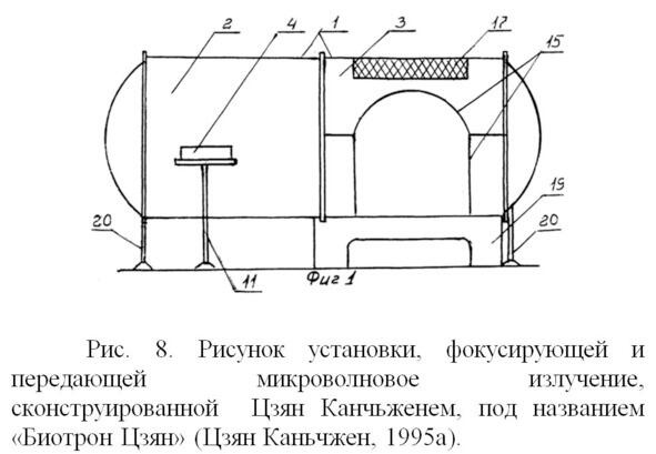 В этом же году Цзян Каньчжен подал заявку на модифицированную установку Биотрон и затем получил на нее патент (Цзян Каньчжен, 1995б). В этом Биотроне (Рис. 9) применяется многоэтажный стеллаж (20) для размещения растений или мелких животных в качестве доноров биологического излучения. Кроме того, в Биотроне установлены специальные радиолинзы (30) для дополнительного концентрирования биоизлучения. В этом же патенте в формуле изобретения он указывает на вариант Биотрона, который образуется двумя противоположными рефлекторами в виде единой сферы без цилиндрической части между ними.