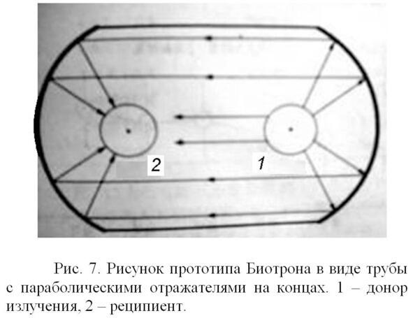 Позже он разработал другую конструкцию в виде трубы большого диаметра. На ее концах были установлены параболические зеркала. В фокусе одного зеркала помещался объект донор излучения, а в фокусе другого зеркала размещался объект реципиент, принимающий биоизлучение (Рис. 7).