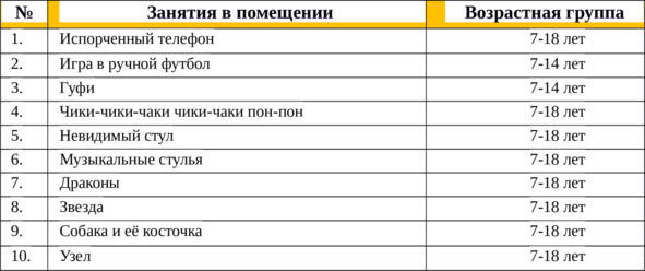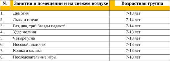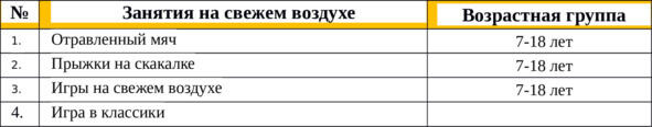 Занятия, проводимые на свежем воздухе те, которые предусмотрены для больших пространств на свежем воздухе. Их перечень представлен в таблице 2.